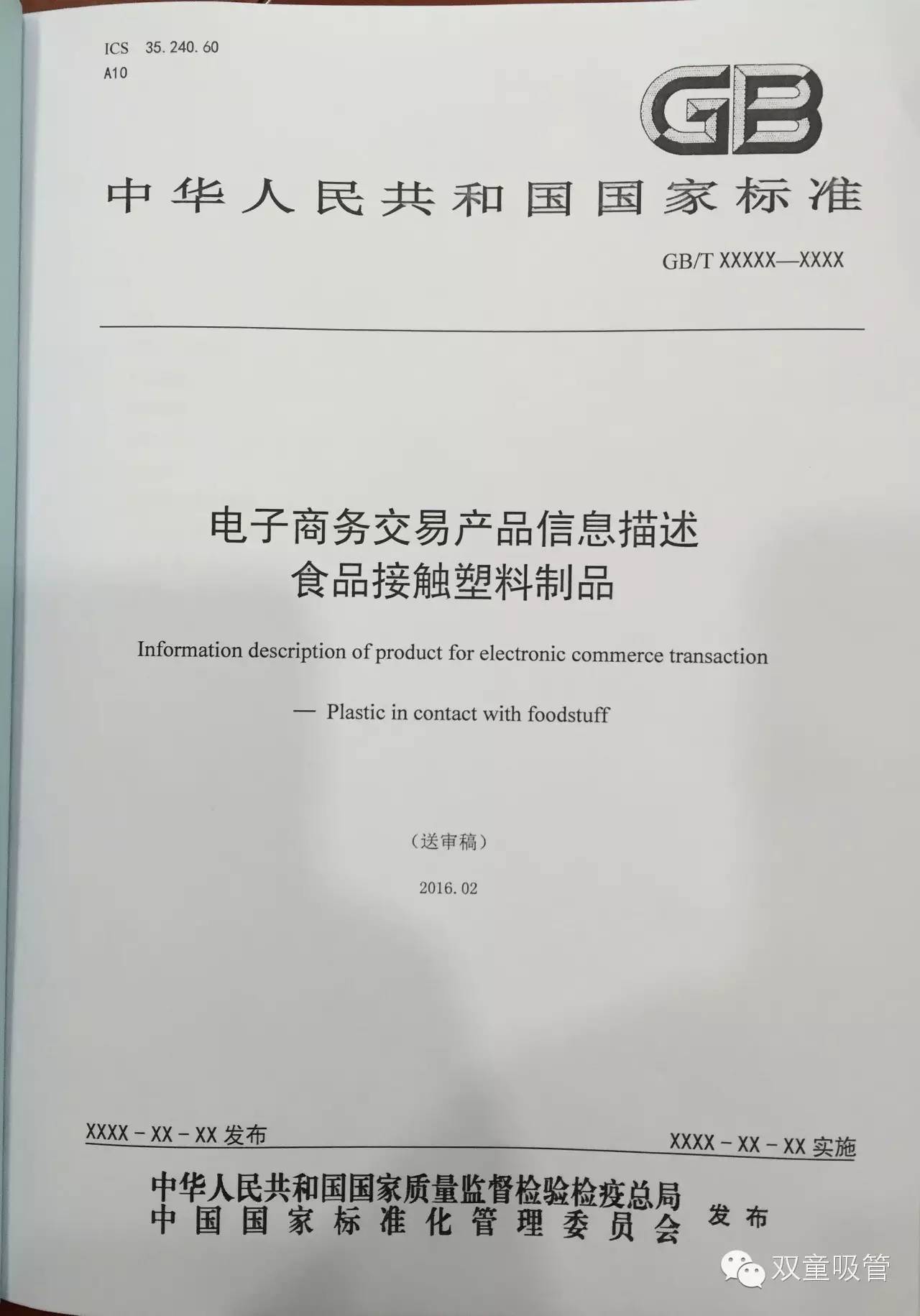 由全國(guó)電子業(yè)務(wù)標(biāo)準(zhǔn)化技術(shù)委員會(huì)(SAC/TC 83)提出,經(jīng)國(guó)家質(zhì)量監(jiān)督檢驗(yàn)檢疫總局批準(zhǔn),由“雙童吸管”作為標(biāo)準(zhǔn)第一起草單位,會(huì)同中國(guó)標(biāo)準(zhǔn)化研究院于2016年3月2日在北京中國(guó)標(biāo)準(zhǔn)化研究院舉行《電子商務(wù)交易產(chǎn)品信息描述 食品接觸塑料制品》國(guó)家標(biāo)準(zhǔn)審定工作。