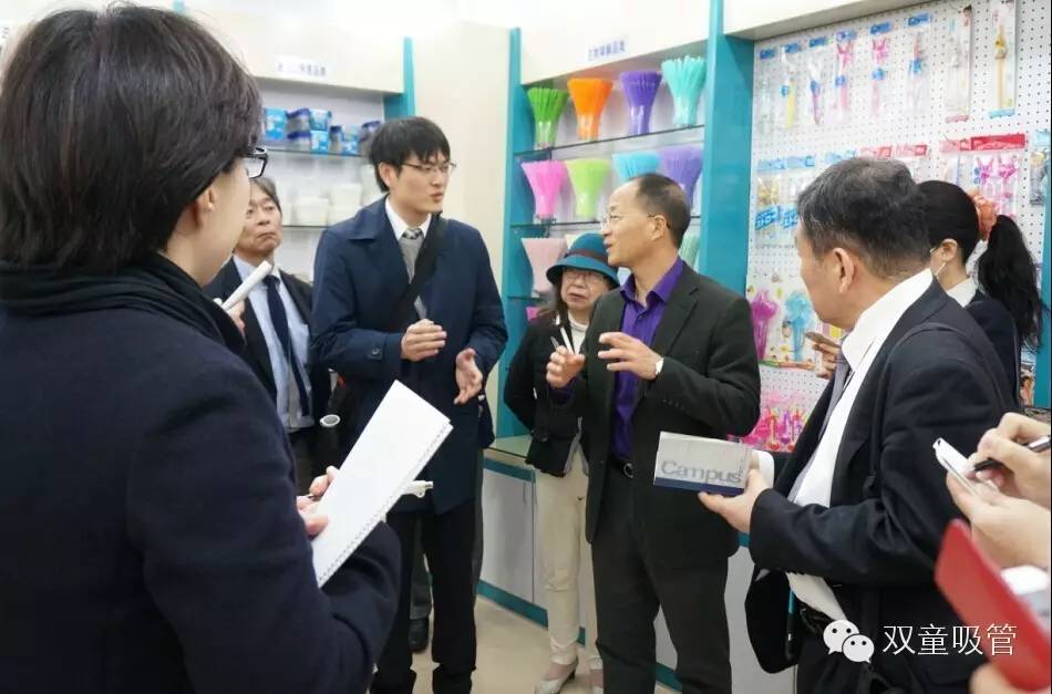 接著,一行人在樓總的指引下,來到了產(chǎn)品樣品房。當(dāng)家人樓總向大家介紹雙童的幾個熱銷創(chuàng)新吸管,而日本的團隊對價值高達3美元的愛心吸管十分感興趣,當(dāng)下就詢問能否賣給他們幾套留作紀念。