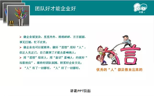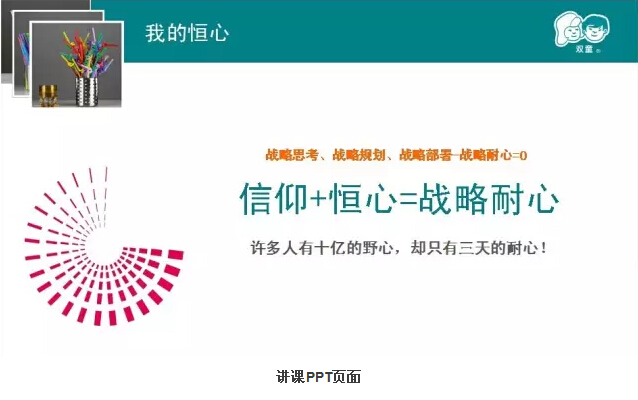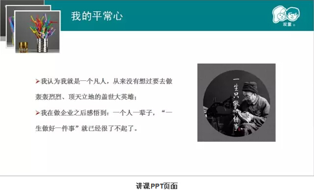 樓總認(rèn)真地準(zhǔn)備了PPT,講述了他的“匠人”之心。從早期創(chuàng)業(yè)過(guò)程的搖擺不定談到雙童吸管發(fā)展的堅(jiān)定;從開(kāi)始的規(guī)?;笈可a(chǎn)講到差異化和品牌化經(jīng)營(yíng),從小商思維談到經(jīng)營(yíng)哲學(xué);他回顧了雙童吸管二十多年的發(fā)展歷程,講到了他所推崇和堅(jiān)持的“三心”,也道出了吸管大王背后的堅(jiān)守和追求。