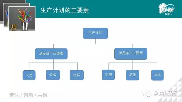 “雙童”堅(jiān)持“小客戶原則以來,每天車間的訂單都不少于200單,如何協(xié)調(diào)好這些單子,對生產(chǎn)計(jì)劃主管來說是一個(gè)大挑戰(zhàn)。張講師從生產(chǎn)計(jì)劃的作用,生產(chǎn)計(jì)劃的三要素,計(jì)劃工作的原則等方面闡述了生產(chǎn)計(jì)劃的重要性。那么,生產(chǎn)計(jì)劃的流程是怎樣的呢?生產(chǎn)計(jì)劃的注意事項(xiàng)及方法又有哪些呢,妞就放上我們講師的PPT和大家一起分享吧!