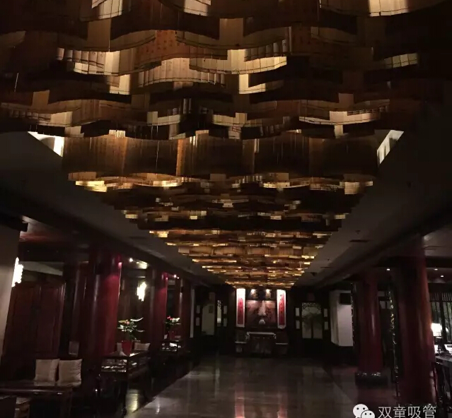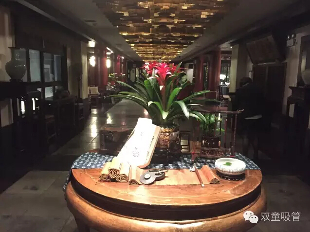 我們?nèi)胱蹑?zhèn)景區(qū)內(nèi)的昭明書(shū)舍酒店,酒店大堂的燈都是用書(shū)簡(jiǎn)裝飾,文房四寶靜靜擺放其中,別有格調(diào)。