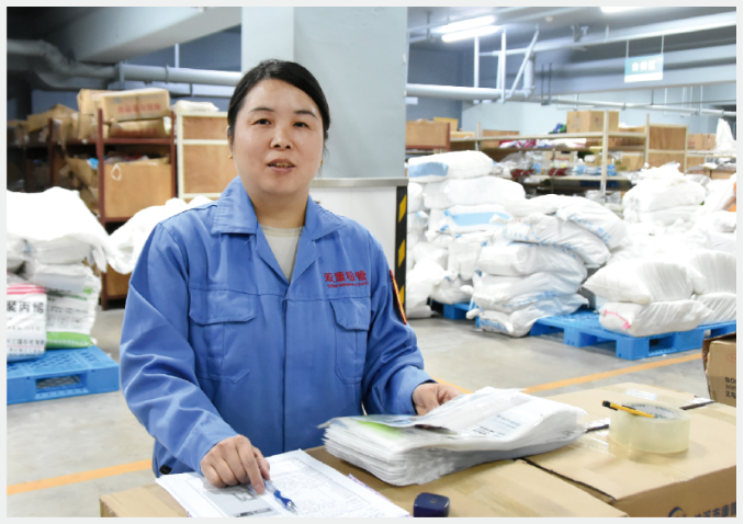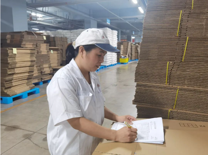 楊小慧正在檢驗(yàn)核對(duì)來(lái)料紙箱