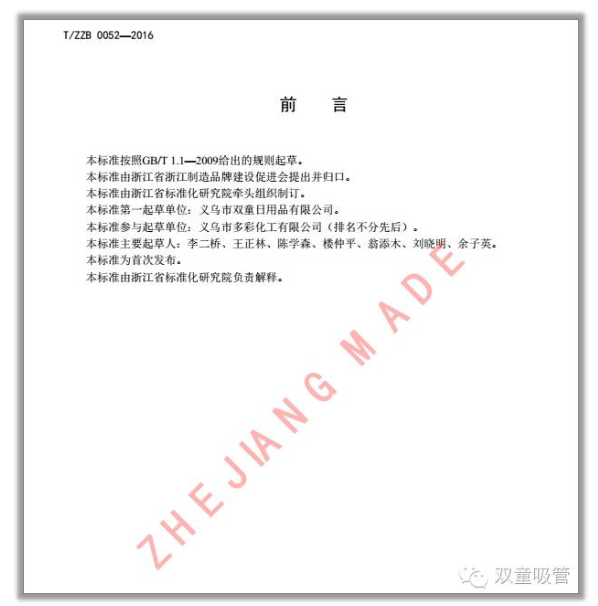 2016年開始,在陳學(xué)森的主導(dǎo)下,“雙童”開展了“浙江制造”多項(xiàng)吸管行業(yè)團(tuán)體標(biāo)準(zhǔn)的起草工作,《聚丙烯飲用吸管》,《聚乳酸可降解冷飲吸管》和《一次性紙質(zhì)飲用吸管》浙江團(tuán)體標(biāo)準(zhǔn),強(qiáng)有力地推進(jìn)了公司的標(biāo)準(zhǔn)化建設(shè),有效地提升行業(yè)影響力和品牌美譽(yù)度。