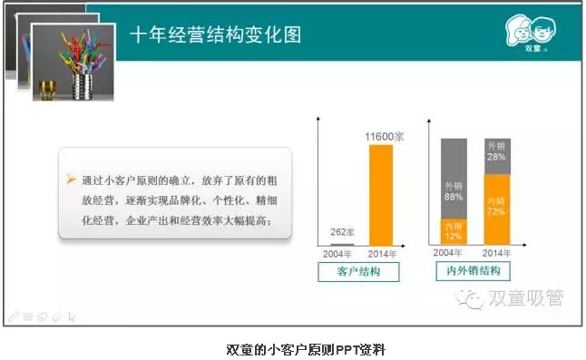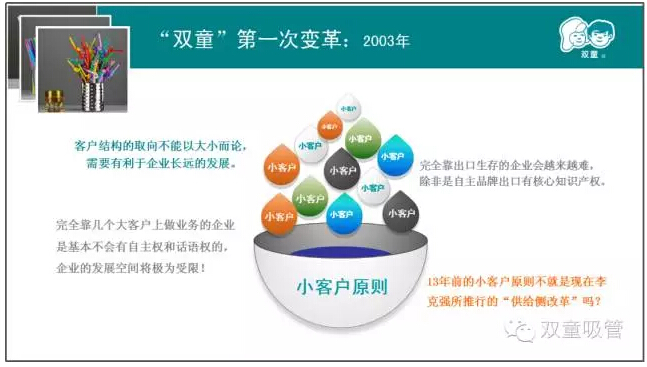 當(dāng)家人介紹,“雙童”的經(jīng)營理念之一便是“小客戶原則”。通過“砍掉”大客戶,專注開發(fā)小客戶的經(jīng)營模式,使“雙童”不斷追求更高品質(zhì)的產(chǎn)品,滿足消費(fèi)者個性化的需要。