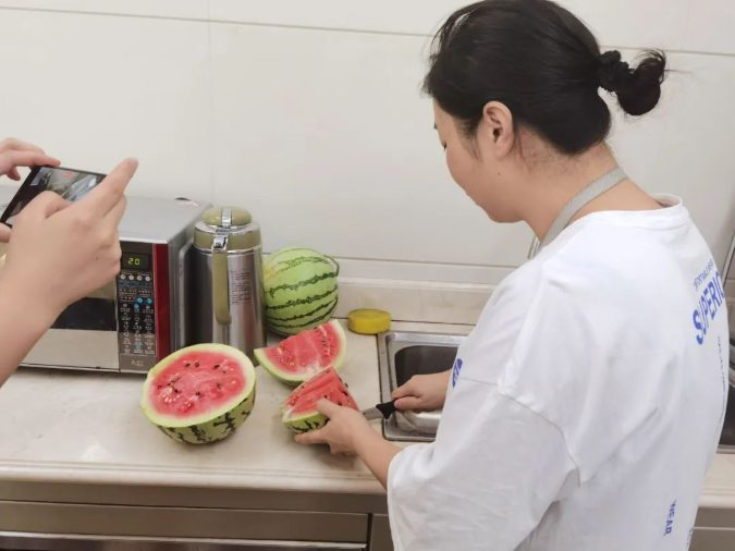 拿到西瓜,大家迫不及待地就現(xiàn)場“殺”瓜了,簡直和開盲盒一樣刺激, 哇哦,這個(gè)瓜顏色可紅了,味道一定不錯(cuò)!