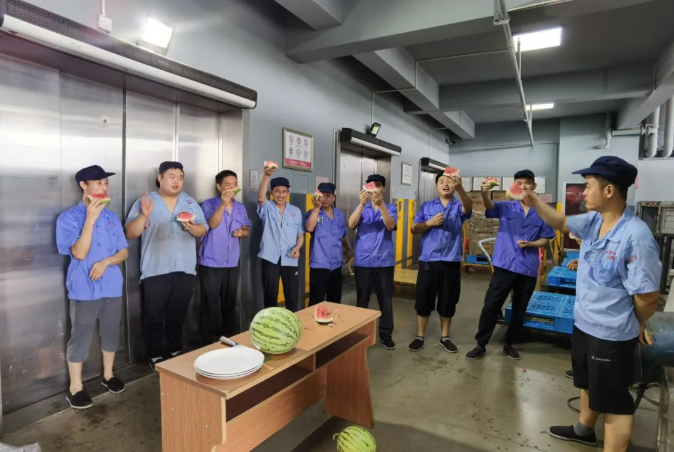 車間一線員工自然也不能落下,“雙童”總經(jīng)理李二橋親自上陣“殺”瓜,他還給大家透露,在他的安徽老家也有一片瓜田,論切西瓜,他可是專業(yè)的
