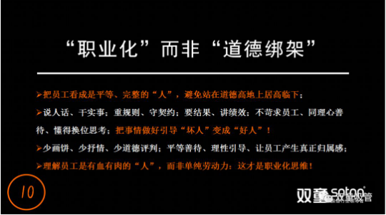 在“理性”思維的持續(xù)引導(dǎo)下,“雙童”在文化中倡導(dǎo)把員工看成是平等、完整的“人”,而非站在道德高地上居高臨下,處處體現(xiàn)尊重、公平和雙贏。我們理解員工是有血有肉的“人”,而非單純的勞動力,對待員工少“畫餅”,少抒情,懂得換位思考,不去“道德綁架”員工,才能讓員工真正產(chǎn)生歸屬感。