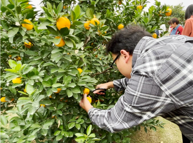 細心剪下橘子,不傷害樹枝
