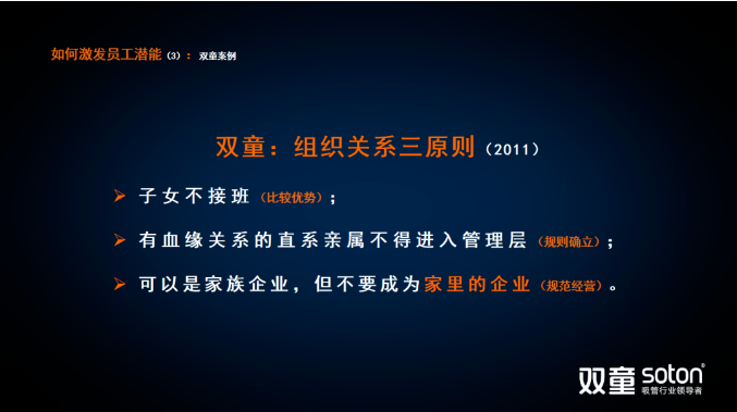 做“家族企業(yè)”還是家里的企業(yè)?其實(shí),兩者之間的界限就在于是否規(guī)范經(jīng)營,這一點(diǎn)在“雙童”的關(guān)系哲學(xué)的“強(qiáng)關(guān)系與弱關(guān)系”中也有體現(xiàn)。弱化血緣關(guān)系,強(qiáng)化規(guī)則關(guān)系;弱化人情關(guān)系,強(qiáng)化契約關(guān)系;弱化個(gè)人關(guān)系,強(qiáng)化團(tuán)隊(duì)關(guān)系;弱化社交關(guān)系,強(qiáng)化社會(huì)關(guān)系。