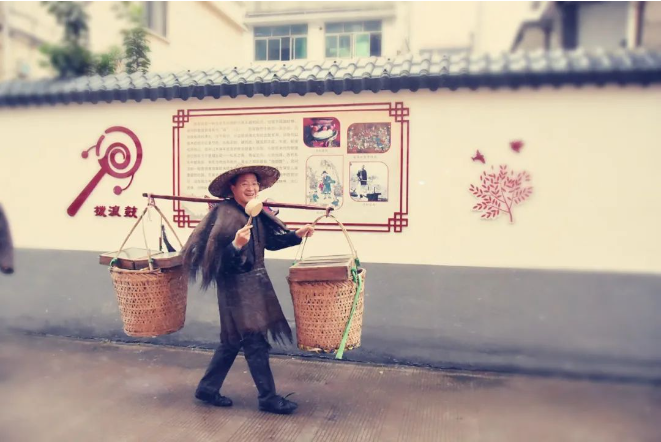 挑“貨郎擔(dān)”用的扁擔(dān)和一般的扁擔(dān)是不一樣的,杉木扁擔(dān)很軟,挑的過程當中會很有節(jié)奏的搖起來。