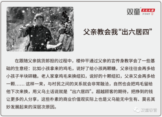 1979年時期的“雞毛換糖”,義烏廿三里已經(jīng)形成了提籃市場。所以我去挑貨郎擔(dān)時已經(jīng)不再是簡單的用糖去換雞毛了,而改用牛皮筋、發(fā)夾、紐扣等小百貨去換“雞毛”。我們“雞毛換糖”的地區(qū)主要是山區(qū),通常我們都會4點起床,5點出門,先走出去20多公里,趕三四個小時的路,然后到規(guī)劃當中最遠的村莊,一邊換雞毛一邊往回走。這樣一來,雞毛換的越來越多,擔(dān)子越來越重時,也離回家的路程越來越近了,從而也就減少了體力消耗。那一年的春節(jié),半個多月的時間,雖然每天都要翻越百里路,道路崎嶇,路途艱險,但我自己并不覺得有多辛苦。磨破腳皮,讓我第一次真正賺到了十多塊錢?;丶乙院螅职衷僭趺戳R我,死活也不去上學(xué)了……