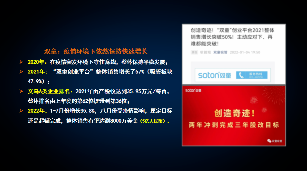 2022年8月,義烏疫情突發(fā),全城封鎖,物流阻斷。12月份中旬開始,義烏再次受疫情侵襲,“雙童”的供應(yīng)鏈、訂單等多方面出現(xiàn)問題,“雙童人”也大面積感染。疫情三年來,從未被打倒的“雙童人”,躺平了半個月,卻依然在2021年高增長的基數(shù)下,創(chuàng)造了不凡的佳績!凡過往,皆為序章,目之所及,皆是未來。為此,2022年12月31日,“雙童創(chuàng)業(yè)共享平臺”舉行一個簡單但又隆重的儀式——“雙童創(chuàng)業(yè)共享平臺”經(jīng)營協(xié)議簽署儀式,和大家一起簽訂一份代表責(zé)任、夢想和遠方的經(jīng)營協(xié)議!