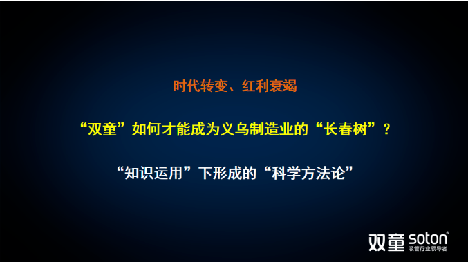 作為一家即將迎來成立30周年的企業(yè),“雙童”所面對的困難是一波一波,具有周期性的。初期“雙童”所面對的挑戰(zhàn)相對容易,我們用品牌、標(biāo)準、專利、產(chǎn)品創(chuàng)新來解決??山陙?,創(chuàng)新紅利已然衰竭,不足以抵擋時代給“雙童”帶來的沖擊。