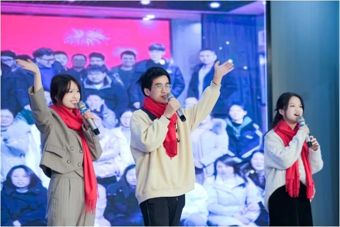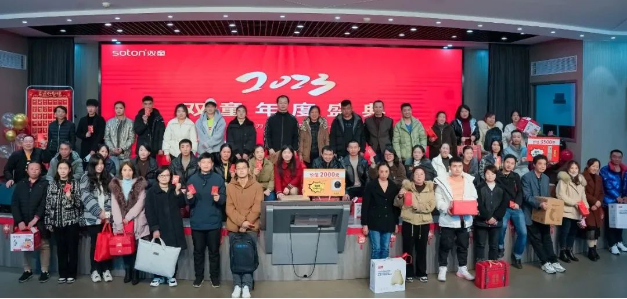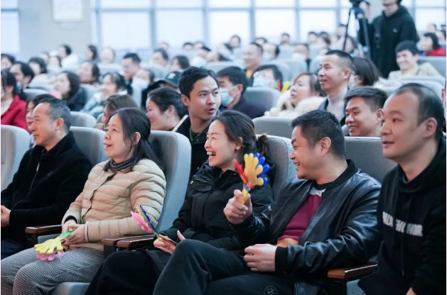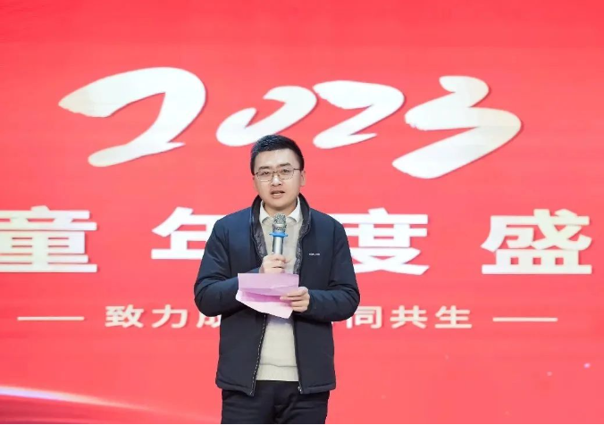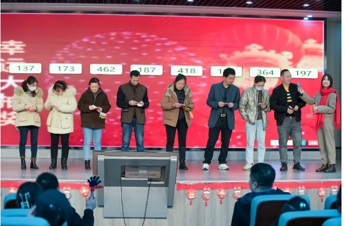 新年祝福視頻過后,現(xiàn)場的喜慶氛圍在一首歌曲表演下達(dá)到了頂峰。由文宣團(tuán)隊(duì)帶來的經(jīng)典歌曲《相親相愛一家人》,這一耳熟能詳?shù)母枨尨蠹叶家黄饟]起手來加入了合唱。伴隨著動人的音樂,背景短片還帶現(xiàn)場所有“雙童人”一起重溫了2022年的溫情瞬間,無論是車間一線生產(chǎn)人員的暖陽般的微笑,還是銷售人員拿著銷冠獎(jiǎng)杯的喜悅,都一一呈現(xiàn)。回顧這一年,可謂是真正的大豐收!