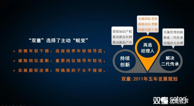 2010年,樓仲平在理解人性活力的“自然遞減”的現(xiàn)象以及經(jīng)理人老化自然規(guī)律后,下定決心通過《雙童五年發(fā)展規(guī)劃》的組織變革來實(shí)施解決“經(jīng)理人老化”問題:明確扶植年輕干部,選拔培養(yǎng)優(yōu)秀的年輕領(lǐng)導(dǎo)層,解決二代傳承接班等問題。