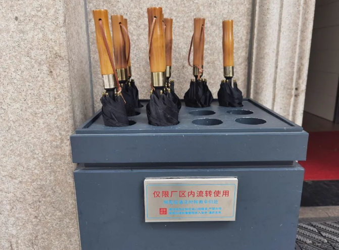 2020年4月,“雙童”董事長樓仲平注意到,下雨天總會有不少員工,因為忘記帶傘而被困在廠房和食堂里,無法出行,這樣不僅耽誤行程、影響工作進度,冒雨而行還可能對健康不利。為此,樓仲平讓后勤部門定制了第一批流動雨傘,在一、二期廠房和宿舍樓下投入使用。