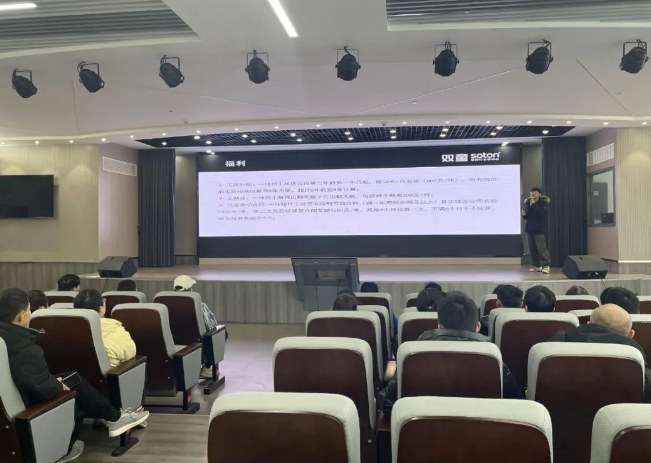 會(huì)議開(kāi)始后,總經(jīng)理助理李戎先對(duì)新員工們的到來(lái)表示了熱烈的歡迎,并從“組織架構(gòu)”、“福利待遇”、“規(guī)章制度”三個(gè)方面,為新員工們解答了大家最關(guān)心的工齡待遇、超產(chǎn)獎(jiǎng)項(xiàng)等問(wèn)題。