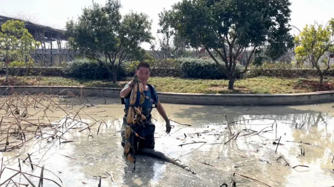 園丁大哥身穿防水服,手拿高壓水槍沖擊淤泥,他彎腰在藕塘里探尋藏在淤泥里的鮮嫩蓮藕,用力一拔,一根一米多長(zhǎng)的藕從淤泥里被拽了出來。