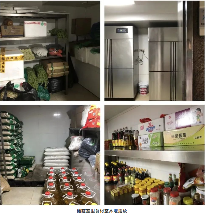 其中采購(gòu)入庫(kù)的魚、肉等易腐爛變質(zhì)的葷菜必須分區(qū)妥善保存在冰箱中,新鮮蔬菜與米、面等主食原料分開存放;除了常規(guī)的食材分開存放外,食用油、大米、面粉、面條、調(diào)味料等食材消耗品,進(jìn)行分類、分架、隔墻、離地存放。