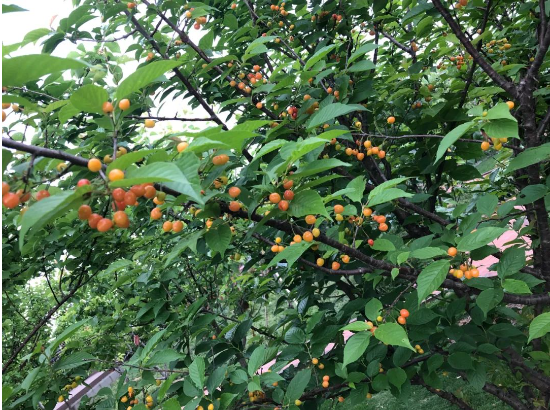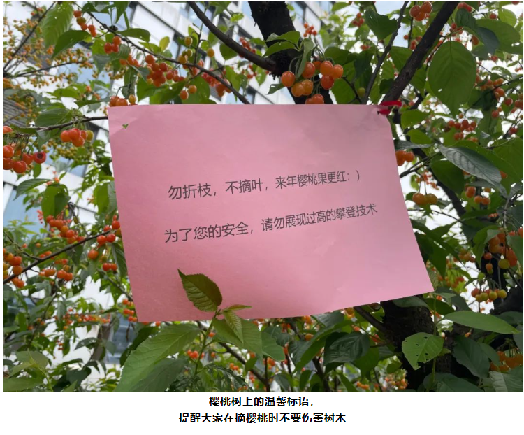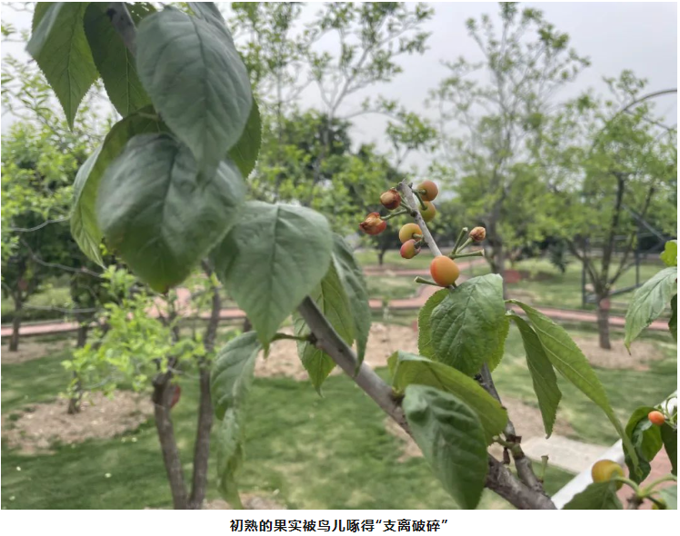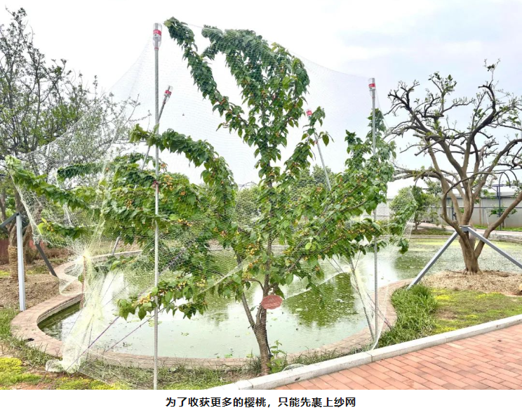 吸管妞可是眼看著這些櫻桃由青轉(zhuǎn)黃,由黃轉(zhuǎn)橙,最后變成紅色的呢!由于光照條件不同的關(guān)系,現(xiàn)在不少果實(shí)還是橙色的。只是沒想到,由于櫻桃太過于可口,不少鳥兒都爭先啄食。為了讓更多果實(shí)留存下來,讓員工和遠(yuǎn)道而來的客人們可以品嘗到新鮮美味的櫻桃,園丁叔叔給還未完全成熟的櫻桃樹裹上了紗網(wǎng)。