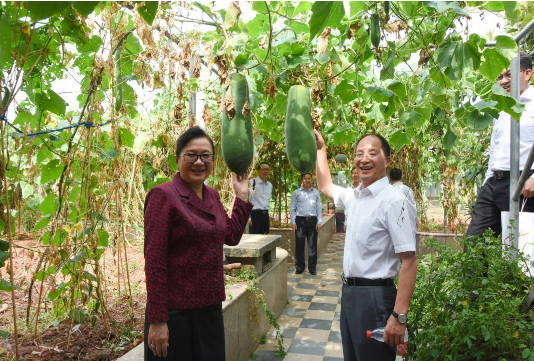 老撾工貿(mào)部部長(zhǎng)與“雙童”樓仲平 的屋頂菜園合影