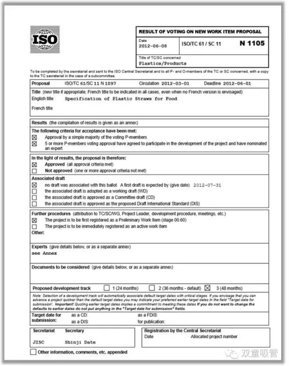 (2).2012年6月8日,《聚丙烯飲用吸管規(guī)范》ISO國際標準起草任務獲2/3成員國投票表決通過。