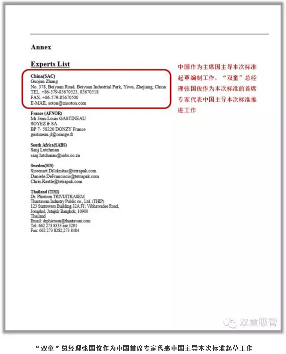 2016年6月27日,瑞士ISO標準化管理組織正式向全球162個成員國下發(fā)了《聚丙烯飲用吸管規(guī)范》ISO國際標準文本。至此,歷經(jīng)九年,輾轉(zhuǎn)六國,由“雙童”代表中國主持起草的《聚丙烯飲用吸管規(guī)范》ISO國際標準終于大功告成!標準起草編制工作圓滿完成。