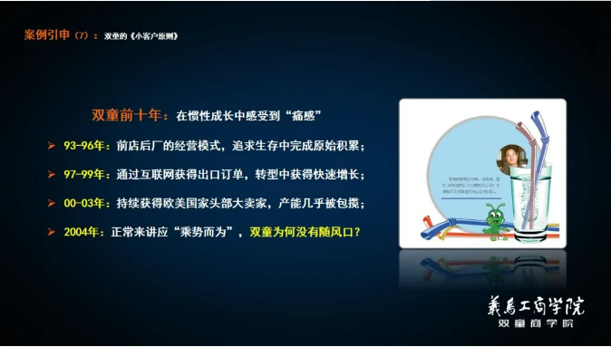 那么,“雙童”是如何通過錯位競爭一步步成為行業(yè)“隱形冠軍”的呢?? 揚(yáng)長避短,錯位創(chuàng)新早在2004年,“雙童”就刻意避開工業(yè)配套類吸管這個賽道,打破“吸管就是喝飲料的”基本假設(shè),通過要素創(chuàng)新,掌握了全球吸管產(chǎn)業(yè)2/3的專利,一步步進(jìn)入吸管產(chǎn)業(yè)鏈的頂端。長期堅持的標(biāo)準(zhǔn)化戰(zhàn)略之路,也讓“雙童”在制定標(biāo)準(zhǔn)的過程中,牢牢掌握了一定的行業(yè)話語權(quán)和規(guī)則制定權(quán)!錯位競爭就是要企業(yè)避開巨頭和領(lǐng)先企業(yè)占據(jù)主導(dǎo)地位的正面競爭,圍繞自己可能的擅長,尋找到合適的錯位,建立自己的競爭優(yōu)勢。從1997年開始,“雙童”已經(jīng)充分利用互聯(lián)網(wǎng)技術(shù),外貿(mào)出口比例一度達(dá)到90%以上。但“雙童”意識到,所謂的“大客戶”,不僅利潤低下,還嚴(yán)重擠壓了企業(yè)優(yōu)質(zhì)中小客戶的訂單,對企業(yè)未來發(fā)展是很不利的。從2004年開始,“雙童”開始慢慢放棄“大客戶”,繞開習(xí)慣依賴的經(jīng)驗主義,轉(zhuǎn)而推行“小客戶原則”。通過戰(zhàn)略轉(zhuǎn)變,“雙童”把原先每100根吸管僅8分錢的利潤,提升到了有20%以上利潤率的提價空間,牢牢掌握了“雙童經(jīng)營的主動權(quán)。