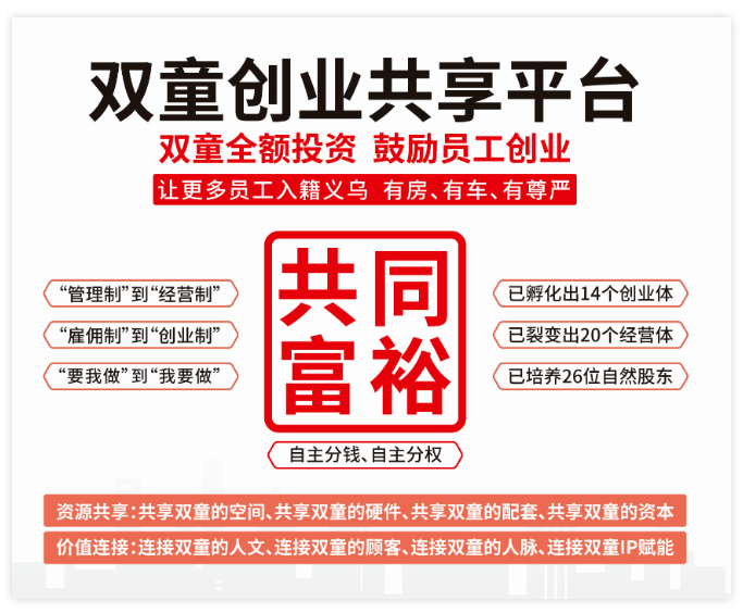 目前已有30多位員工在義烏及周邊區(qū)域買房,40個家庭在義烏落籍成為義烏人,14位員工成為創(chuàng)業(yè)體總經理,產生了20位雙童創(chuàng)業(yè)共享平臺股東。