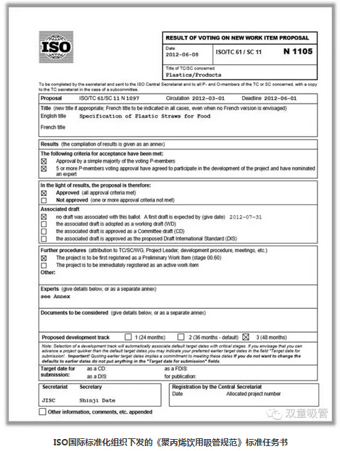 2008年7月,雙童在完成《聚丙烯飲用吸管》行業(yè)標(biāo)準(zhǔn)、國家標(biāo)準(zhǔn)的起草編制任務(wù)后,向ISO標(biāo)準(zhǔn)化管理組織申請了國際標(biāo)準(zhǔn)的起草制定任務(wù)。四年后,中國、泰國、瑞典、法國、南非五國組成的《聚丙烯飲用吸管規(guī)范》國際標(biāo)準(zhǔn)起草委員會成立。