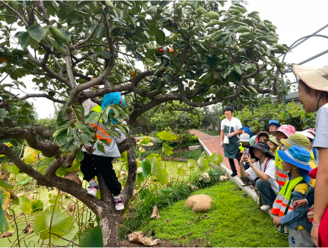 后面講解員帶領(lǐng)小朋友們前往此次游學(xué)的最后一站——“雙童”空中生態(tài)園。在這里,“雙童”講解員輔助幼兒園老師將小朋友們分為三組,然后繪聲繪色地向小朋友們介紹著“花園中”果樹的品種,通過故事性的表達讓小朋友們更加直觀地了解到其中的差別,也增長了他們的自然知識。