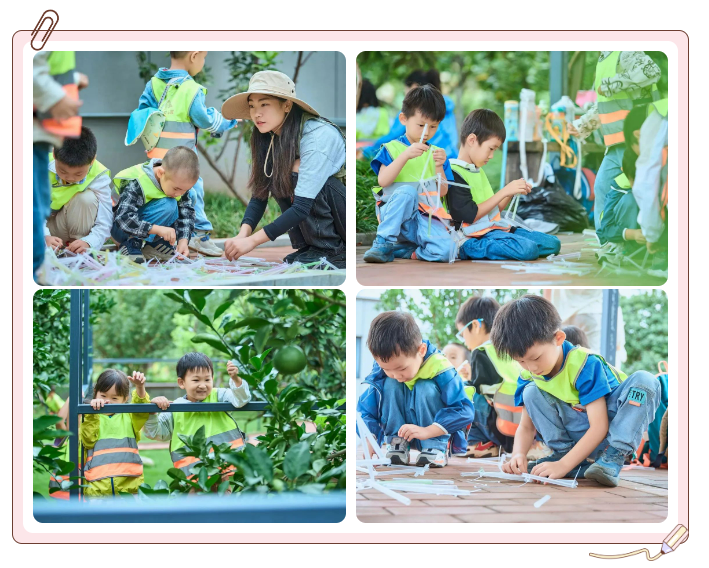 當(dāng)然,幼兒園的老師們也精心準(zhǔn)備了益智游戲——編制吸管網(wǎng)。也就是把吸管作為“網(wǎng)線”,一點一點拼接為一張很大的網(wǎng)。看,小朋友們做的多么認(rèn)真。