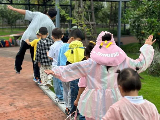 沿著馬路牙子走“獨木橋”是小孩子獨有的樂趣