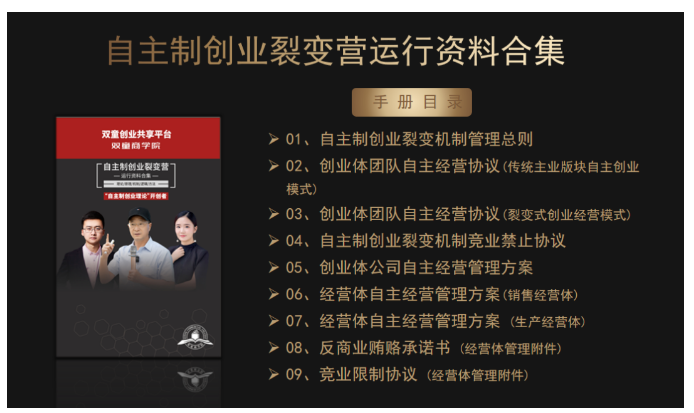 3、交付自主制創(chuàng)業(yè)裂變模式的各項規(guī)則、文本、合同等書面資料