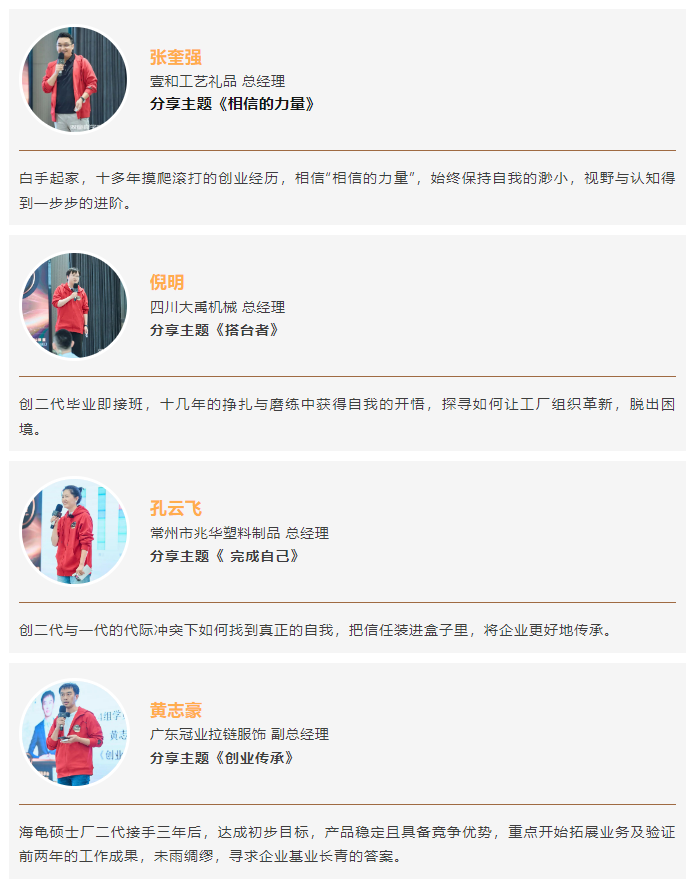 因此,在開學(xué)典禮上,四位具有代表性的學(xué)員分享介紹了自己在企業(yè)經(jīng)營(yíng)的心路歷程,并表達(dá)了升級(jí)思維的期待,解決目前的企業(yè)傳承與轉(zhuǎn)型發(fā)展問題。