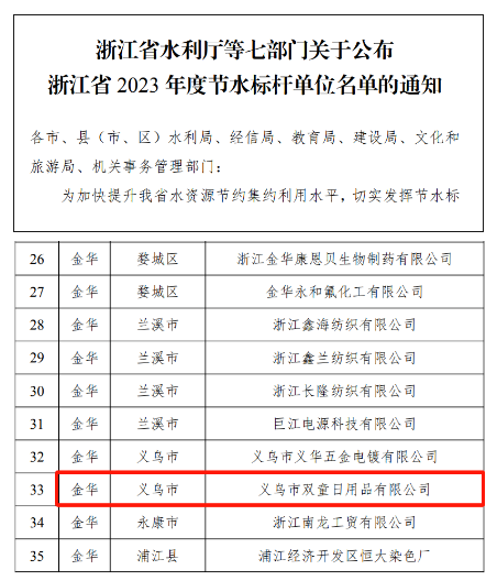 近日,浙江省水利廳等七個(gè)部門聯(lián)合公布了浙江省2023年度節(jié)水標(biāo)桿單位名單,義烏市雙童日用品有限公司再次上榜!
