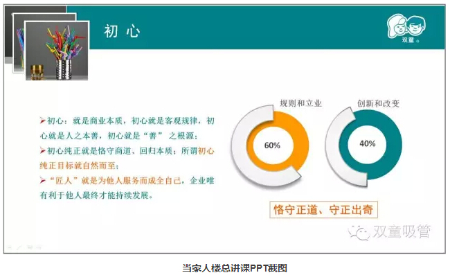 接下來,當(dāng)家人樓總對“雙童”的“匠人之心”進行了深入的分享,匠心分為“三心”——“初心”、“恒心”、”平常心“。