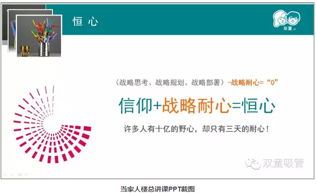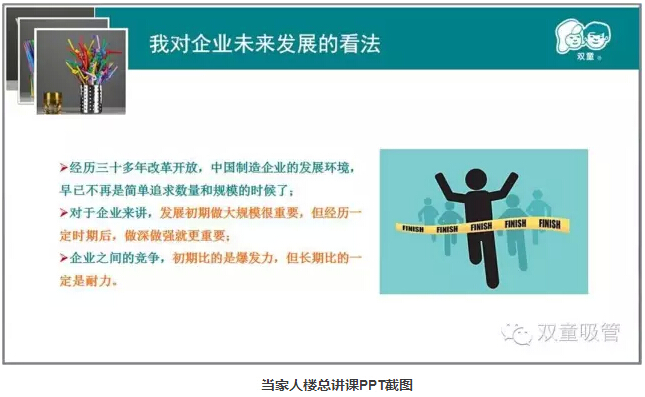 恒心則需要有以10年為單位的戰(zhàn)略耐心。以博大的胸懷把一件事情做好。當(dāng)家人說,”雙童“的創(chuàng)新工作都是以十年為一個單位來進行。而當(dāng)家人自己則是”老板不解眼前憂“,培養(yǎng)專業(yè)的經(jīng)理人團隊去解決企業(yè)問題,自己把目光放長遠,每五年做一次“五年規(guī)劃”。