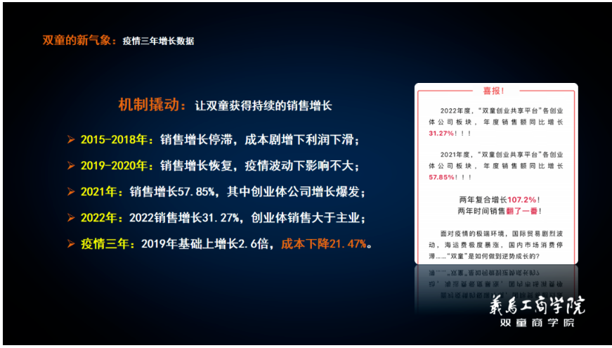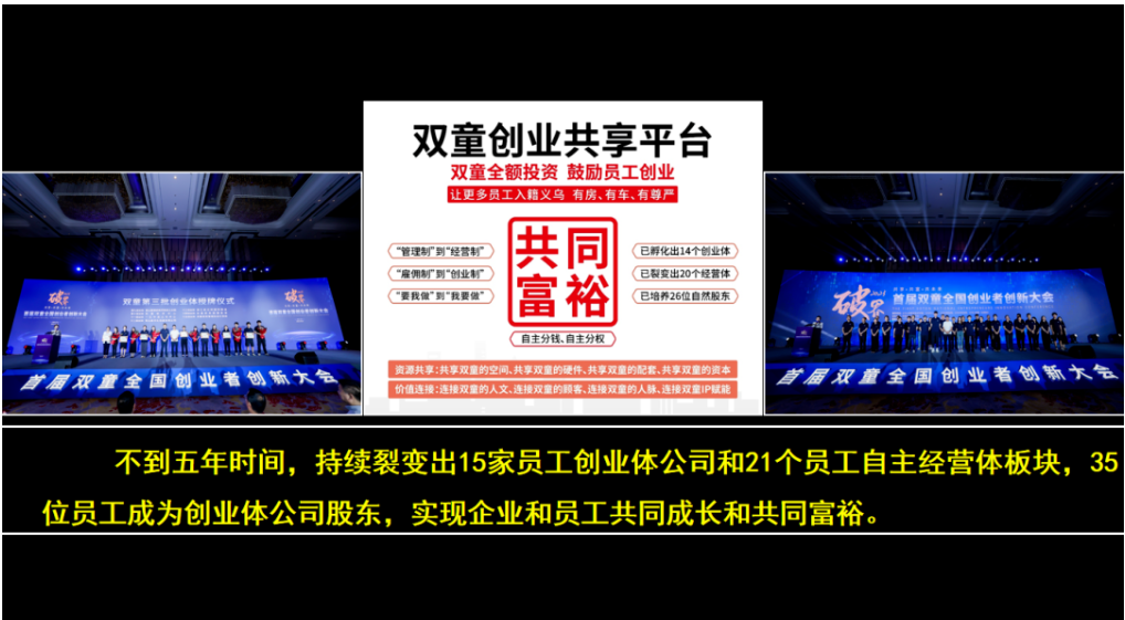 2018年開始,第二創(chuàng)業(yè)體的“雙童進(jìn)出口”和第三創(chuàng)業(yè)體的“義童國際貿(mào)易”相繼成立,成為我們國際貿(mào)易板塊的主力軍。2020年6月,第五創(chuàng)業(yè)體的“雙童商學(xué)院”成立,開啟了公司創(chuàng)業(yè)教育的新板塊;第六創(chuàng)業(yè)體、第七創(chuàng)業(yè)體、第八創(chuàng)業(yè)體、第九創(chuàng)業(yè)體……,不到五年時(shí)間,持續(xù)裂變出15家員工創(chuàng)業(yè)體公司,和21位員工自主經(jīng)營體板塊,35位員工在公司獲得了創(chuàng)業(yè)的機(jī)會(huì),成為了真正創(chuàng)業(yè)公司的創(chuàng)始股東,推動(dòng)員工實(shí)現(xiàn)從打工到老板的華麗轉(zhuǎn)身,實(shí)現(xiàn)企業(yè)和員工的共同成長和共同富裕。在過去的疫情三年時(shí)間里,我們依然保持2.6倍的快速增長,公司在義烏企業(yè)的綜合排名也從2019年的92位,一路上揚(yáng)進(jìn)入到去年的第32位。員工創(chuàng)業(yè)板塊的創(chuàng)新業(yè)務(wù),在短短五年時(shí)間里再造了兩個(gè)雙童。
