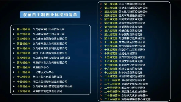 目前,雙童創(chuàng)業(yè)共享平臺已經(jīng)成功孵化了15個創(chuàng)業(yè)體、26個經(jīng)營體,助力了41個員工實(shí)現(xiàn)從管理者向創(chuàng)業(yè)者的轉(zhuǎn)變,實(shí)現(xiàn)了員工和企業(yè)的共同富裕!