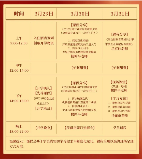 課程交付中,樓仲平老師將分享其成長背后的底層邏輯《企業(yè)與創(chuàng)業(yè)者的邏輯關(guān)系》,岳喜偉老師則帶來《發(fā)動(dòng)創(chuàng)業(yè)者的成長引擎帶領(lǐng)企業(yè)穿越生命周期》課程分享。