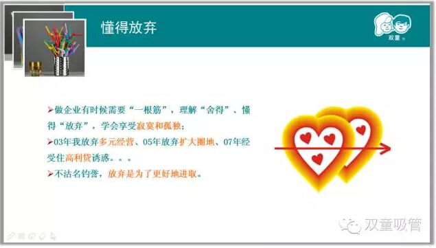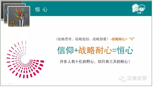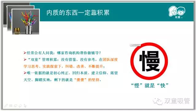 我們強調(diào)戰(zhàn)略思考、戰(zhàn)略規(guī)劃、戰(zhàn)略部署,唯獨缺少戰(zhàn)略耐心。雙童堅持小客戶原則,堅持對員工投入,堅持走差異化的道路,雙童的發(fā)展也越來越好。創(chuàng)新就是改變,就是持續(xù)積累。創(chuàng)新需要戰(zhàn)略耐心,需要十年為一個單位的恒心。