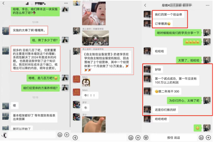 為了能夠助力更多中小企業(yè)也能運(yùn)用這套機(jī)制實(shí)現(xiàn)快速增長(zhǎng),雙童商學(xué)院早在2022年,雙童商學(xué)院就針對(duì)該機(jī)制打磨成《自主制創(chuàng)業(yè)裂變營(yíng)》課程,并不斷地升級(jí)迭代,該課程已經(jīng)是一套非常成熟的、可復(fù)制、可實(shí)踐的課程,完全契合中小微創(chuàng)業(yè)者的需求,報(bào)名人數(shù)也從原來(lái)的幾十人變成現(xiàn)在期期爆滿的“百人團(tuán)”!