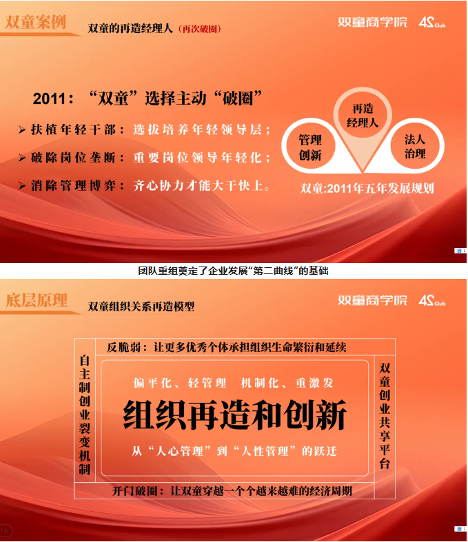 2011年,“雙童”選擇主動“破圈”,再造經(jīng)理人,催生出新生代管理層;2017年之后,“雙童”再次破圈,逐漸從固化中走出,徹底打開組織邊界,推動搭建創(chuàng)業(yè)共享平臺,第二曲線發(fā)展迅速,5年間裂變出15家創(chuàng)業(yè)公司。