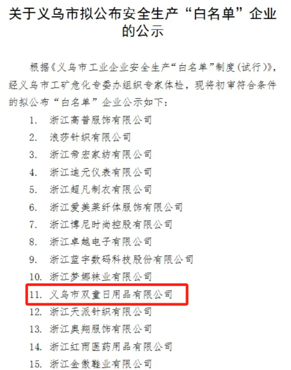 安全重于泰山,安全生產(chǎn)“白名單”企業(yè)這份榮譽(yù),既是肯定,也是鞭策,在今后的工作中,“雙童”也會(huì)繼續(xù)做好安全學(xué)習(xí),努力增強(qiáng)員工的自我管理、自防、自救能力,樹立安全意識(shí),共創(chuàng)一個(gè)安全、有序、高效的生產(chǎn)環(huán)境!