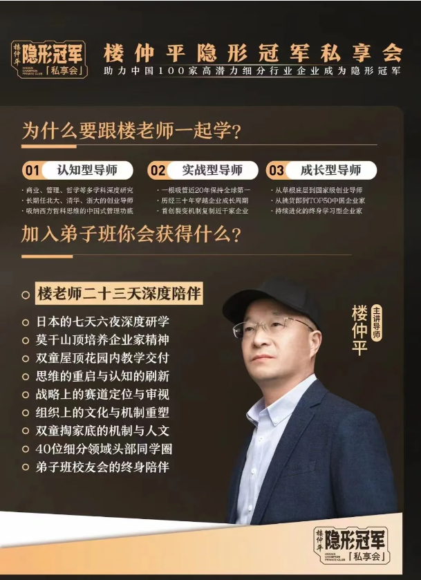 【樓仲平隱形冠軍私享會(huì)】是樓總唯一一個(gè)全面系統(tǒng)交付46年創(chuàng)業(yè)歷程的經(jīng)驗(yàn)總結(jié)和思維模型的課程。全年6期課程,樓老師23天深度陪伴,從戰(zhàn)略到組織,從創(chuàng)新思維到企業(yè)家精神,幫助你的企業(yè)全方位升級(jí)。