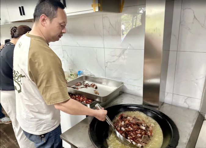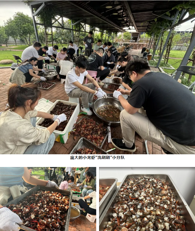 等到300斤小龍蝦被運到空中花園時,所有的小伙伴都已經(jīng)準(zhǔn)備就緒了,有專門去頭取蝦線的小分隊,小龍蝦“洗刷刷”小分隊、傳送小分隊和后廚配菜、掌勺小分隊,大家分工明確,同步進(jìn)行,配合相當(dāng)完美,就像平時在工作中一樣有默契,每一個步驟都不假人手,親自完成,滿滿參與感!