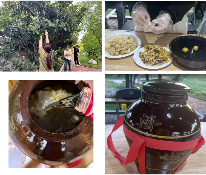 于是,大家馬上分工采摘、剝皮、清洗、注酒、封壇,動作行云流水,一壇承載著所有銷售經(jīng)營體小伙伴們美好愿望的“枇杷酒”就此誕生了,靜待業(yè)績滿滿的下個月,開壇慶祝!
