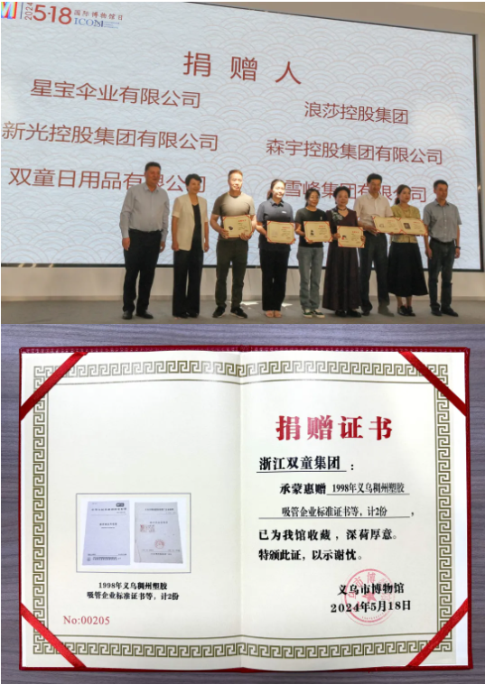 “雙童”作為義烏市場(chǎng)發(fā)展的參與者與見證者,由雙童第五創(chuàng)業(yè)體總經(jīng)理周上代表公司為新館“添磚加瓦”,捐贈(zèng)兩項(xiàng)標(biāo)準(zhǔn)原件,即:1998年,首件吸管行業(yè)企業(yè)標(biāo)準(zhǔn);2009年,金華市首件國(guó)家標(biāo)準(zhǔn)-《聚丙烯飲用吸管》國(guó)家標(biāo)準(zhǔn)。這兩件標(biāo)準(zhǔn),也代表了義烏的中小企業(yè)在發(fā)展過程中對(duì)標(biāo)準(zhǔn)化、規(guī)范化的追求!