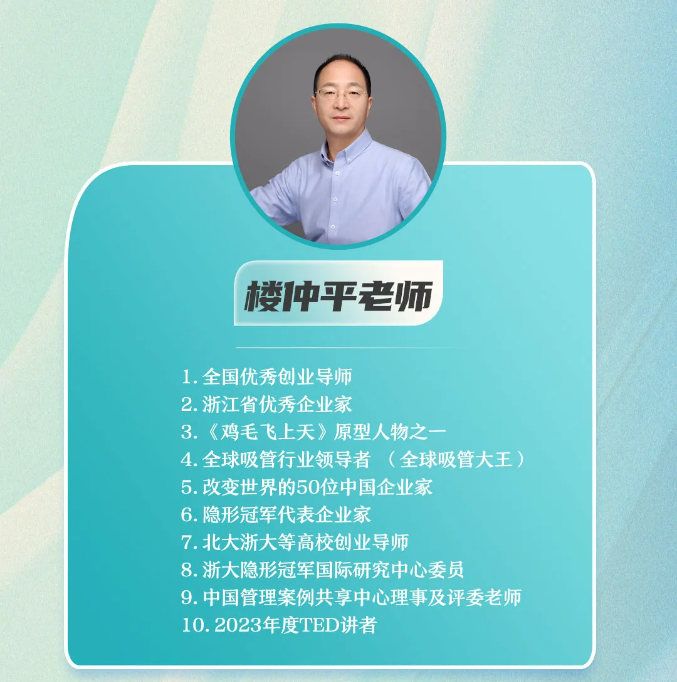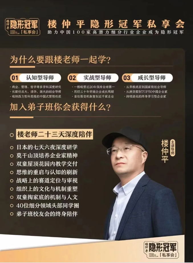 【樓仲平隱形冠軍私享會】是樓總唯一一個全面系統(tǒng)交付46年創(chuàng)業(yè)歷程的經(jīng)驗總結(jié)和思維模型的課程。全年6期課程,樓老師23天深度陪伴,從戰(zhàn)略到組織,從創(chuàng)新思維到企業(yè)家精神,幫助你的企業(yè)全方位升級。